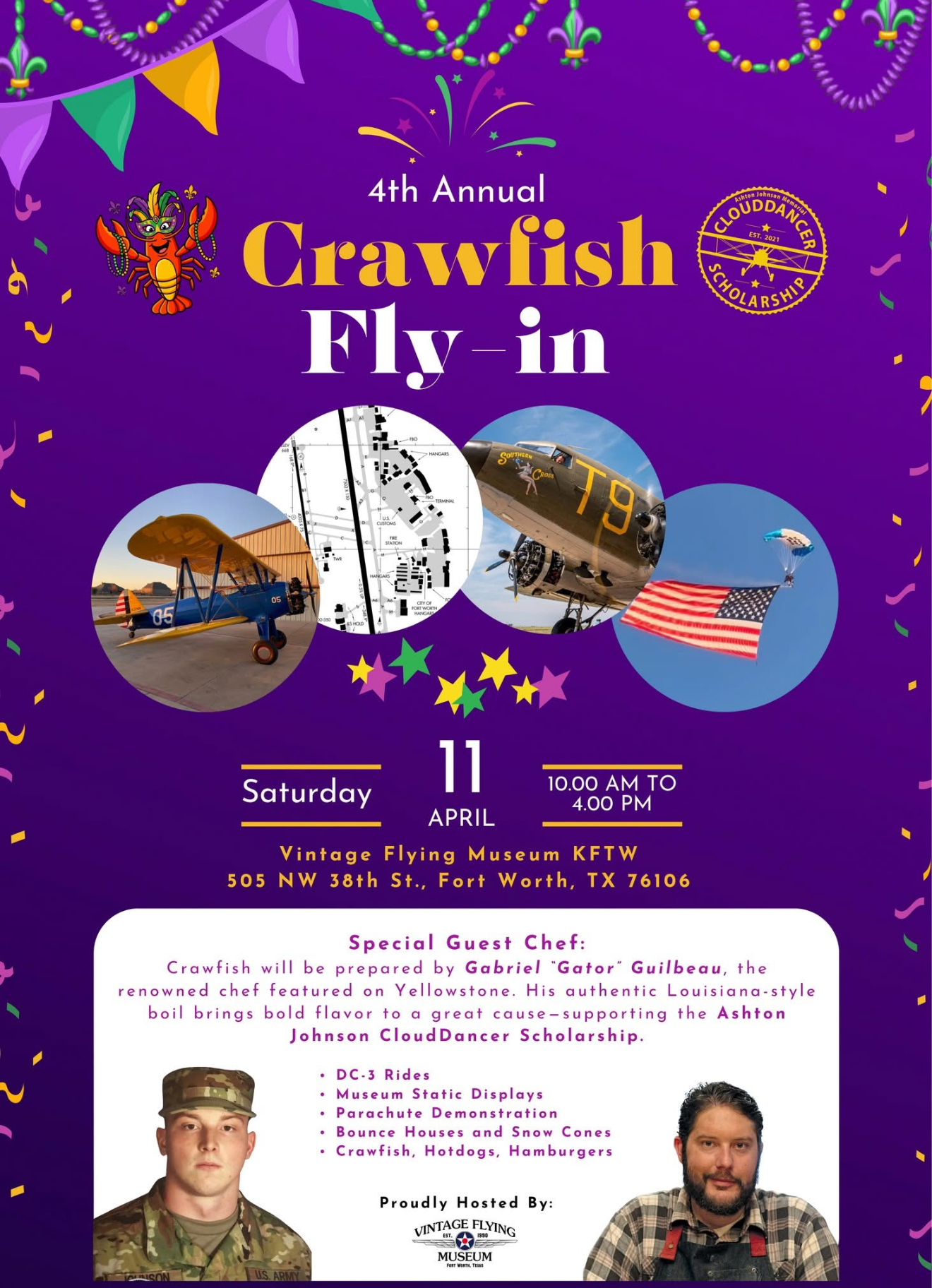 Come fly with us at the Vintage Flying Museum for the 4th Annual Crawfish Fly-In to support the Ashton Johnson CloudDancer Scholarship. Flights starting at 11am!